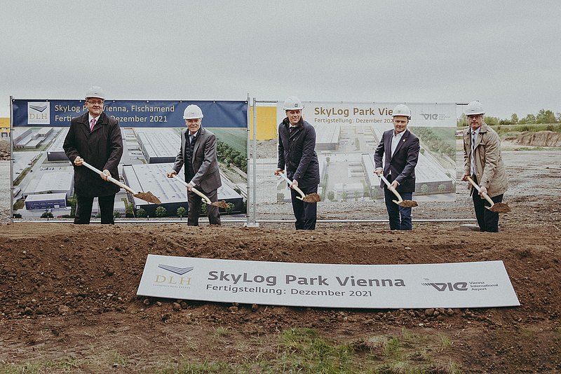 Fischamend, 7.5.2021. Gestern wurde der Spatenstich für den SkyLog Park des Logistikunternehmens DLH Österreich durchgeführt. Im Beisein von Mag. Jochen Danninger, Wirtschaftslandesrat Niederösterreich, Mag. Thomas Ram, Bürgermeister Fischamend, DI Christian Vogt, Geschäftsführer von DLH Österreich und Dr. Günther Ofner, Vorstand der Flughafen Wien AG wurde damit der Startschuss für ein großes Immobilienprojekt getätigt. Auf einer Fläche von rund 45.000 m2 am Rande des Flughafen-Areals und nahe Fischamend entstehen bis Ende 2021 fünf flexible Lager- und Industrial Light Hallen, die speziell für Luftfrachtlogistiker exzellent nutzbar sind. Unternehmen profitieren dabei von der Nähe zum Flughafen sowie zur Autobahn in Richtung Osteuropa. Für die Region rund um Fischamend bedeutet dieses Projekt zusätzliche Wertschöpfung und Arbeitsplätze.