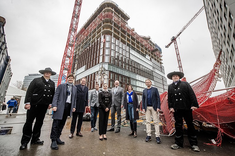 v.l. Klaus Rosenberger (Zimmermann), Gerhard Feldmeyer (Senior Partner HPP Architekten), Oberbürgermeister Stadt Düsseldorf Dr. Stephan Keller, Uwe Rittmann (Mitglied der Geschäftsführung PwC Germany), Khadija Al Kiyumi (Head of Real Estate Department Oman Investment Authority), Stefan H. Mühling (Geschäftsführer die developer Projektentwicklung), Antje Schlotter (Partnerin PwC Germany), Hubertus Dreßler (Geschäftsführer Dreßler Bau), Klaus Jantke (Polier/ Hochbau Dreßler Bau)
