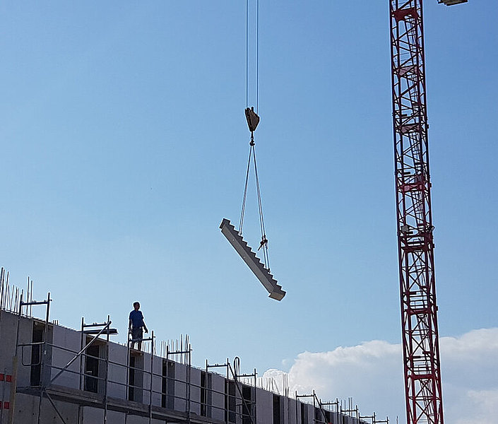 Die Rohbauarbeiten am dritten Quartier LOOP_SIDE unseres Bauprojektes AM FLUSS IN SPEYER gehen voran: Vergangene Woche wurden die Treppen, die später aus dem 1.OG ins 2.OG führen werden, mit Hilfe der beiden 30m hohen Baukräne eingesetzt. Neben den Treppen wurde auch die Decke des 1.OGs in Filigranfertigteilen errichtet und erste Wände des 2.OGs eingezogen.